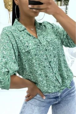 Chemise Fluide Verte Fleurie Ă Col Ă Revers Et Ă Manches Mi-longues Et Fausses Poches Ă La Poitrine