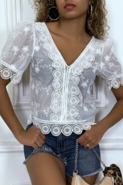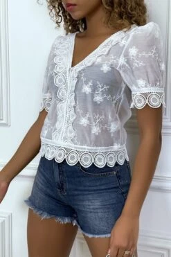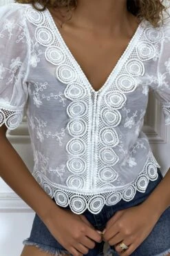 Blouse blanche ajourée en col V