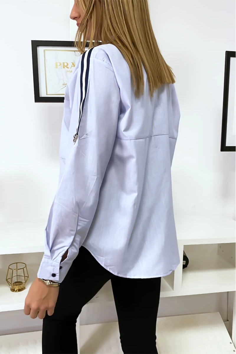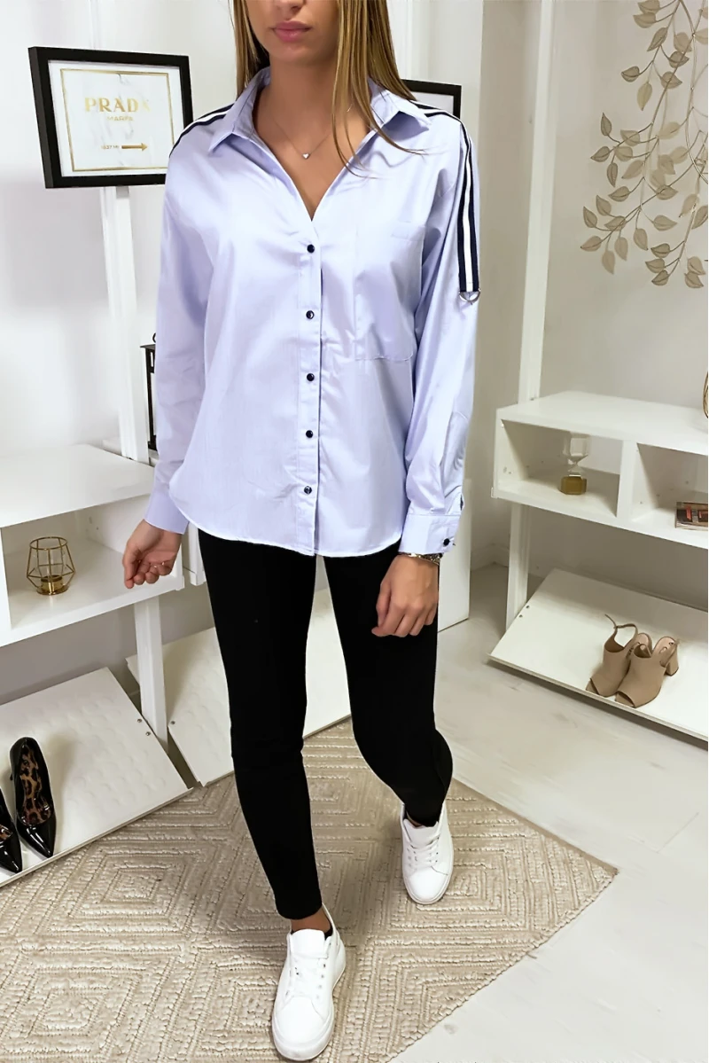 Chemise Bleue clair à bande rayé sur épaules. Effet oversize, la chemise est un incontournable de votre garde robe.