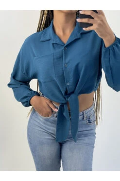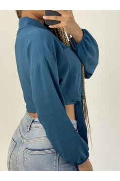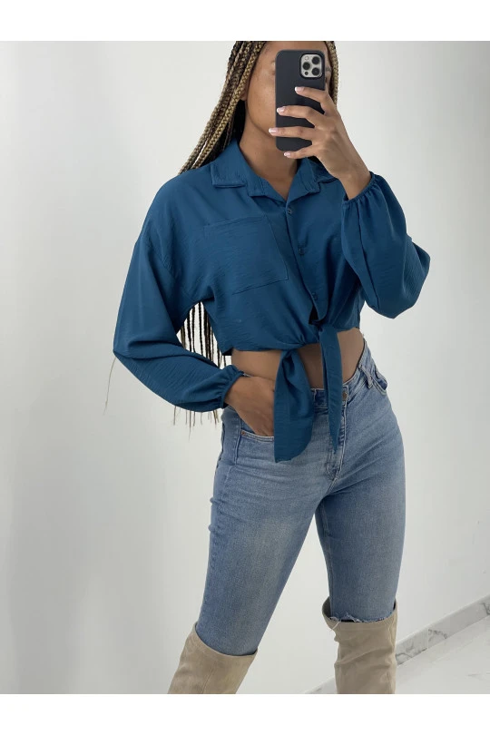 Chemise cropée bleu canard à nouer à manches longues bouffantes. Chemise courte très tendance style bohème.