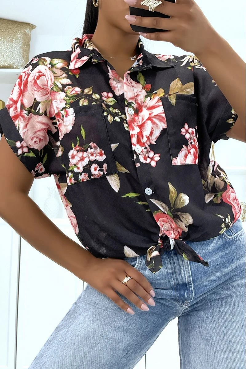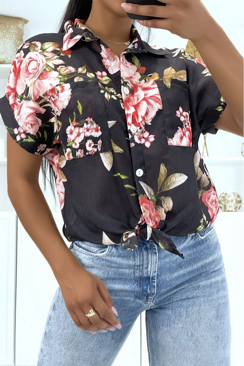 Chemise fleurie noire à manches mi-longues et col à revers en voile épais et jolis boutons