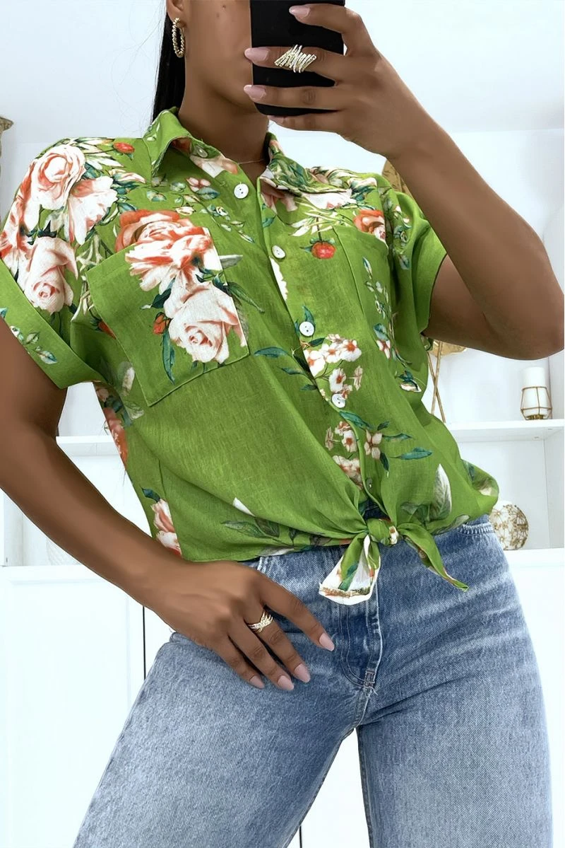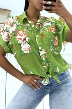 Chemise fleurie vert à manches mi-longues et col à revers en voile épais et jolis boutons