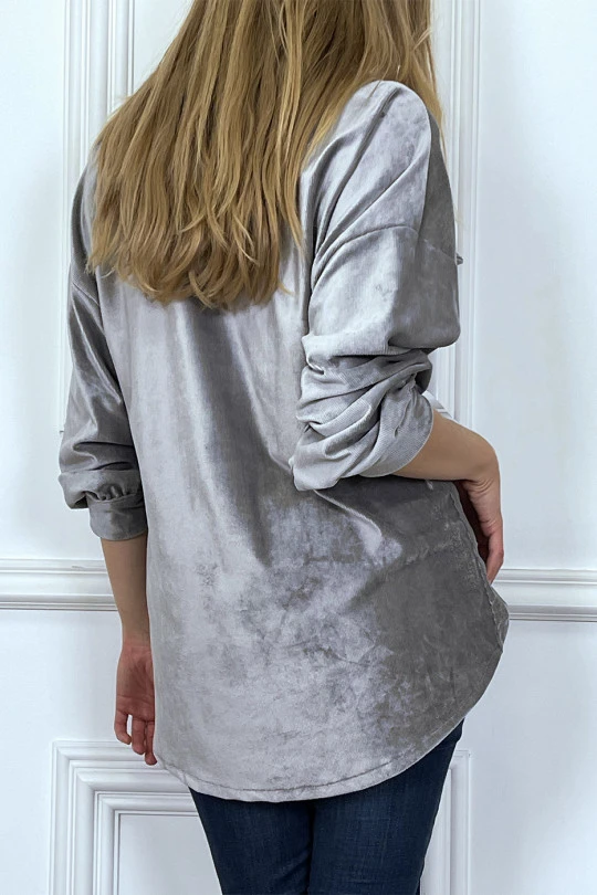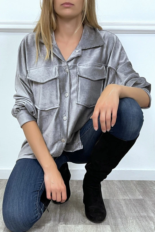 Chemise over size en velours gris avec poches. Chemise femme en velours très fashionÂ
