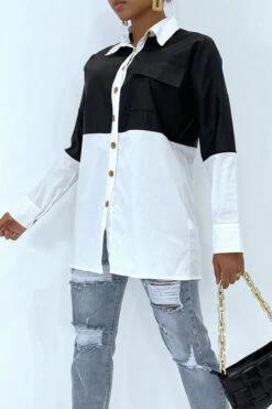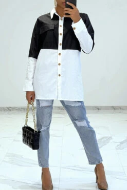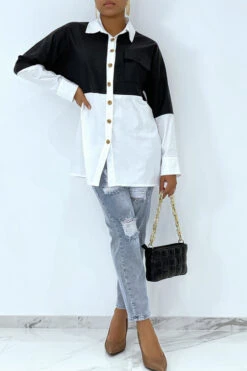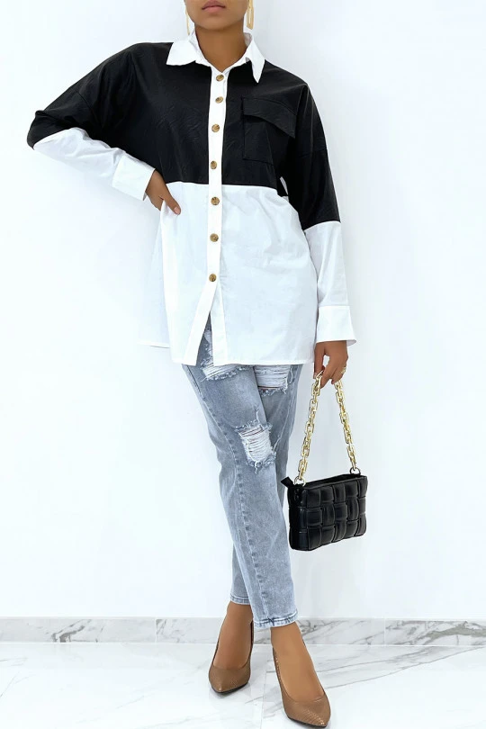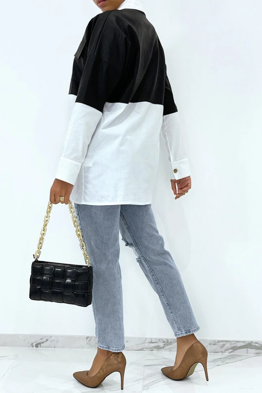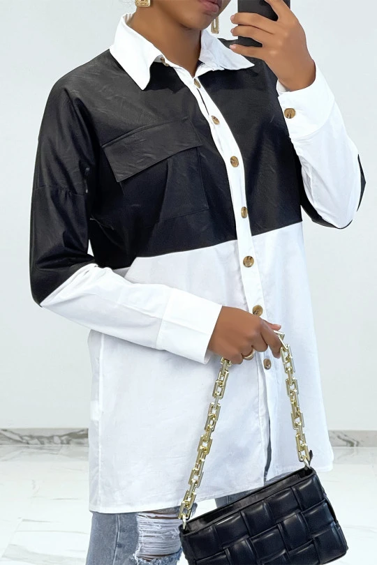 Chemise oversize bi-matière blanche à empiècement en cuir noir. Chemise originale à manches longues très tendance.