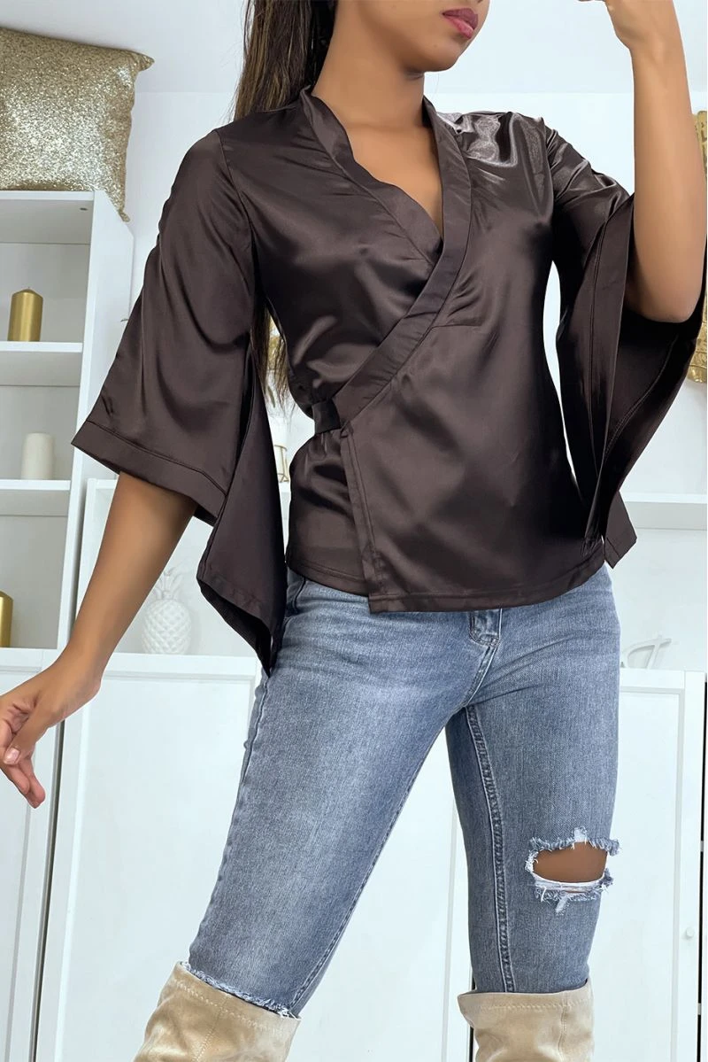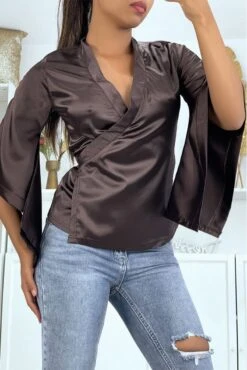 Mega destockage Chemisier cache coeur Marron satine a manches trapezes. Chemisier Chic. 20
