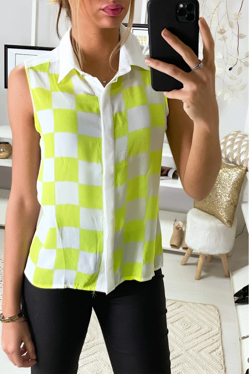 Chemisier Jaune sans manche à imprimés carreaux en voilage.