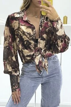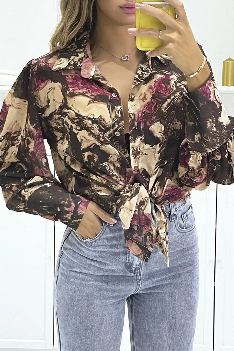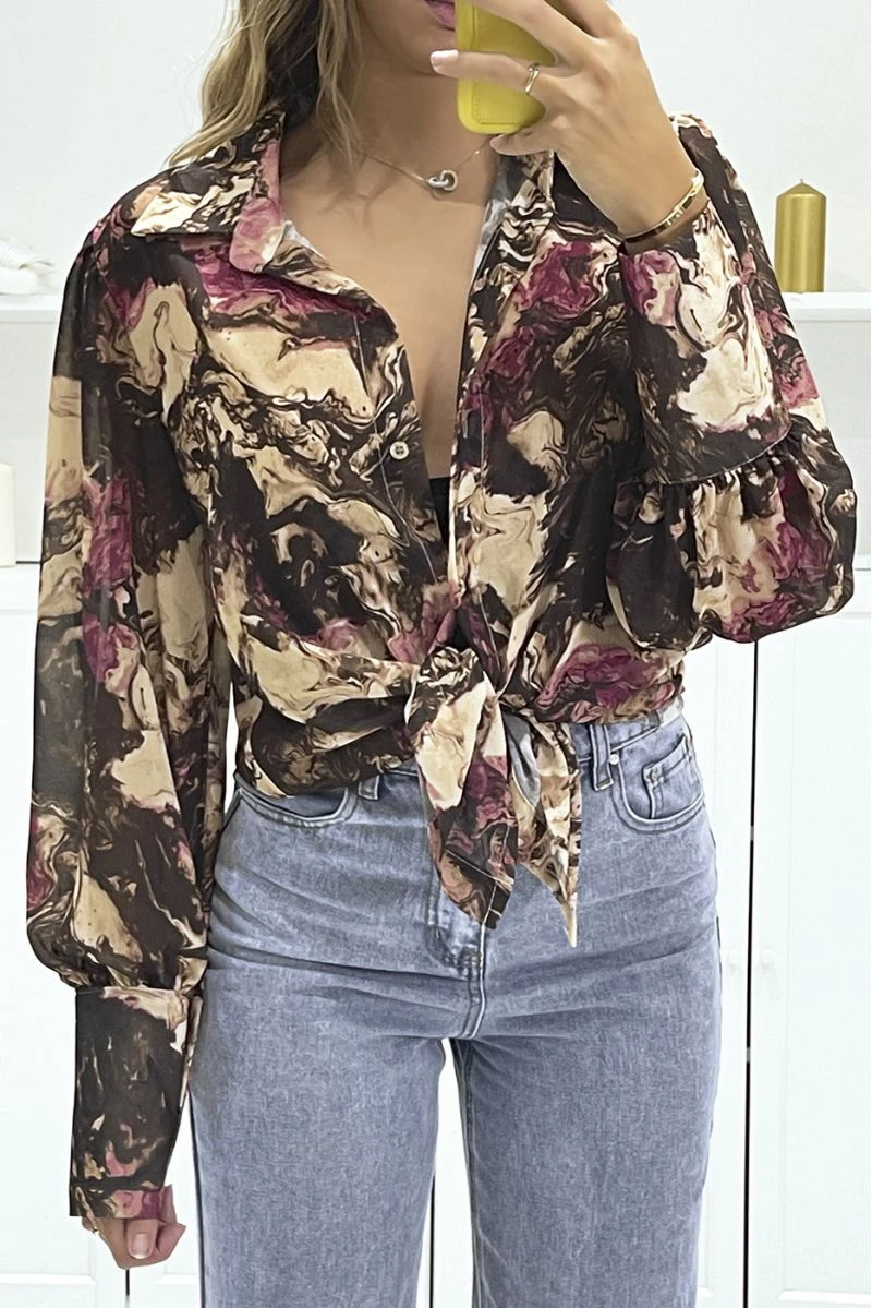 Chemisier marron en voilage avec imprimé abstrait avec nœud