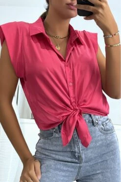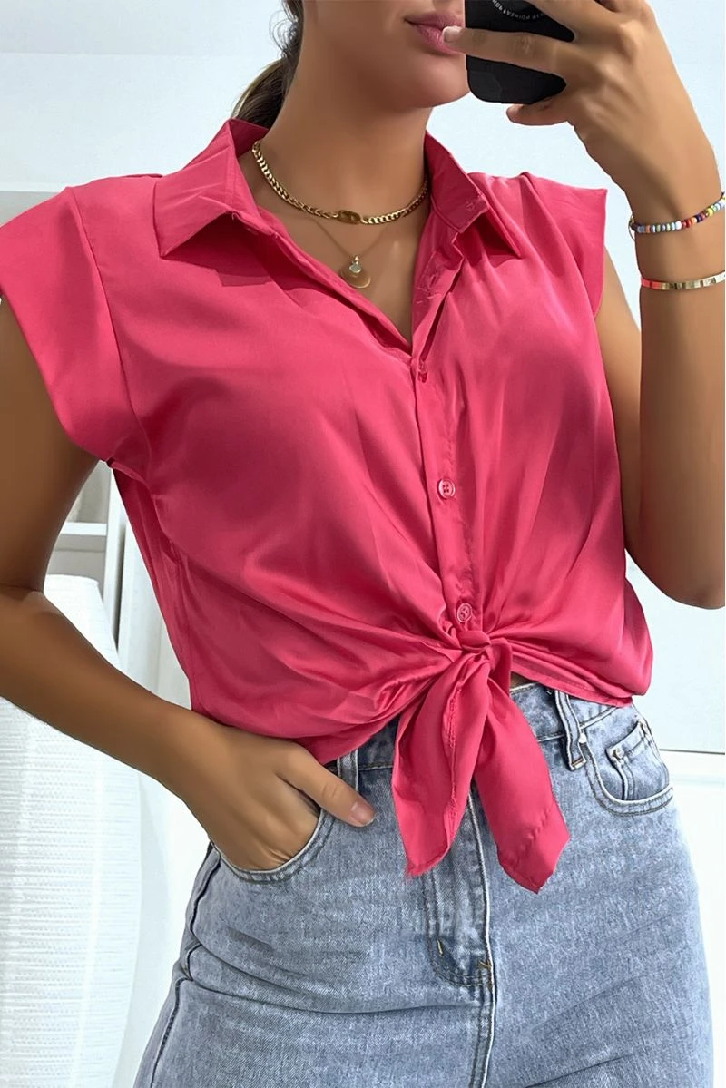 Chemisier satiné fuchsia court à boutons col à revers et manches courtes hyper glamour