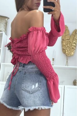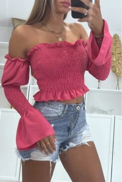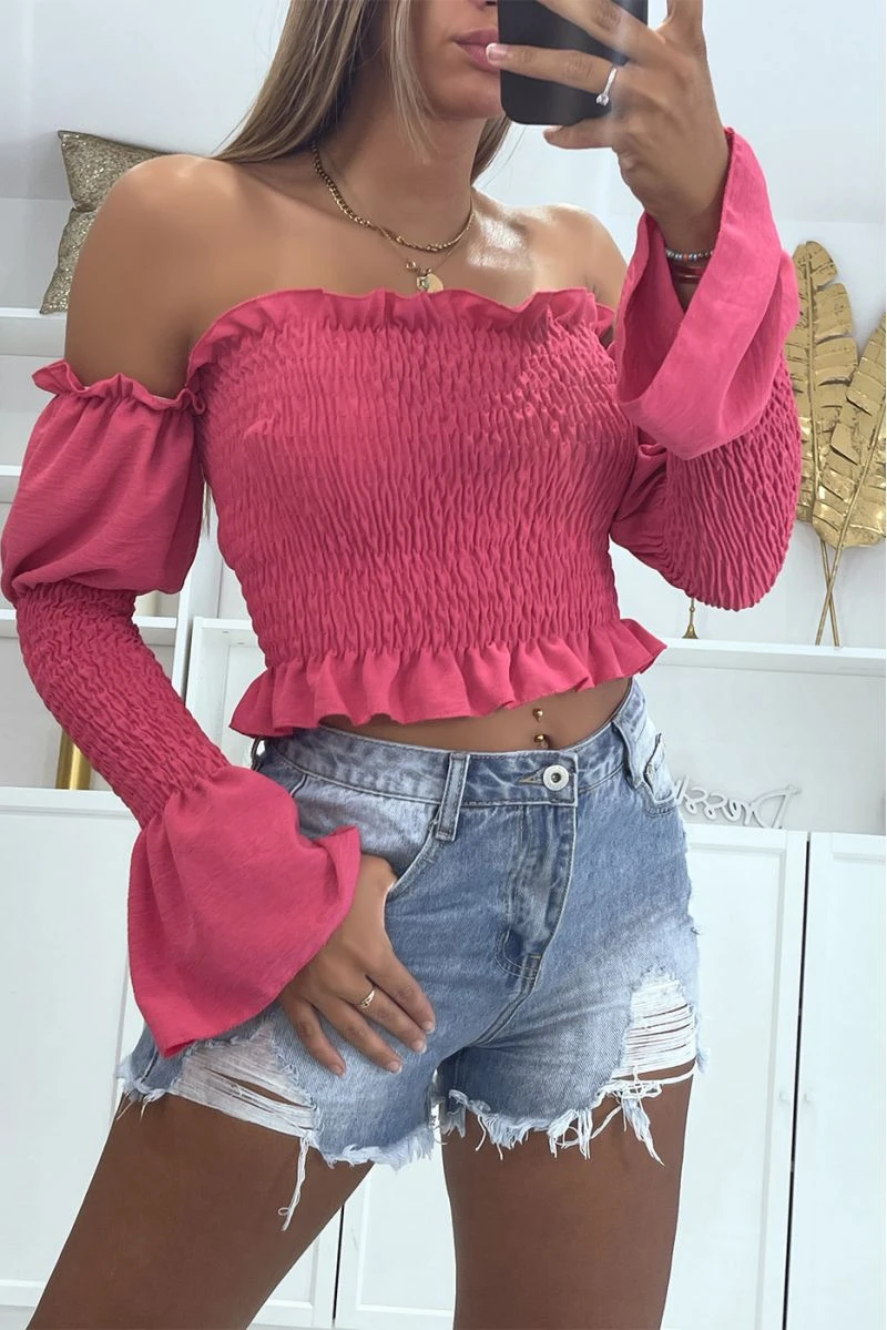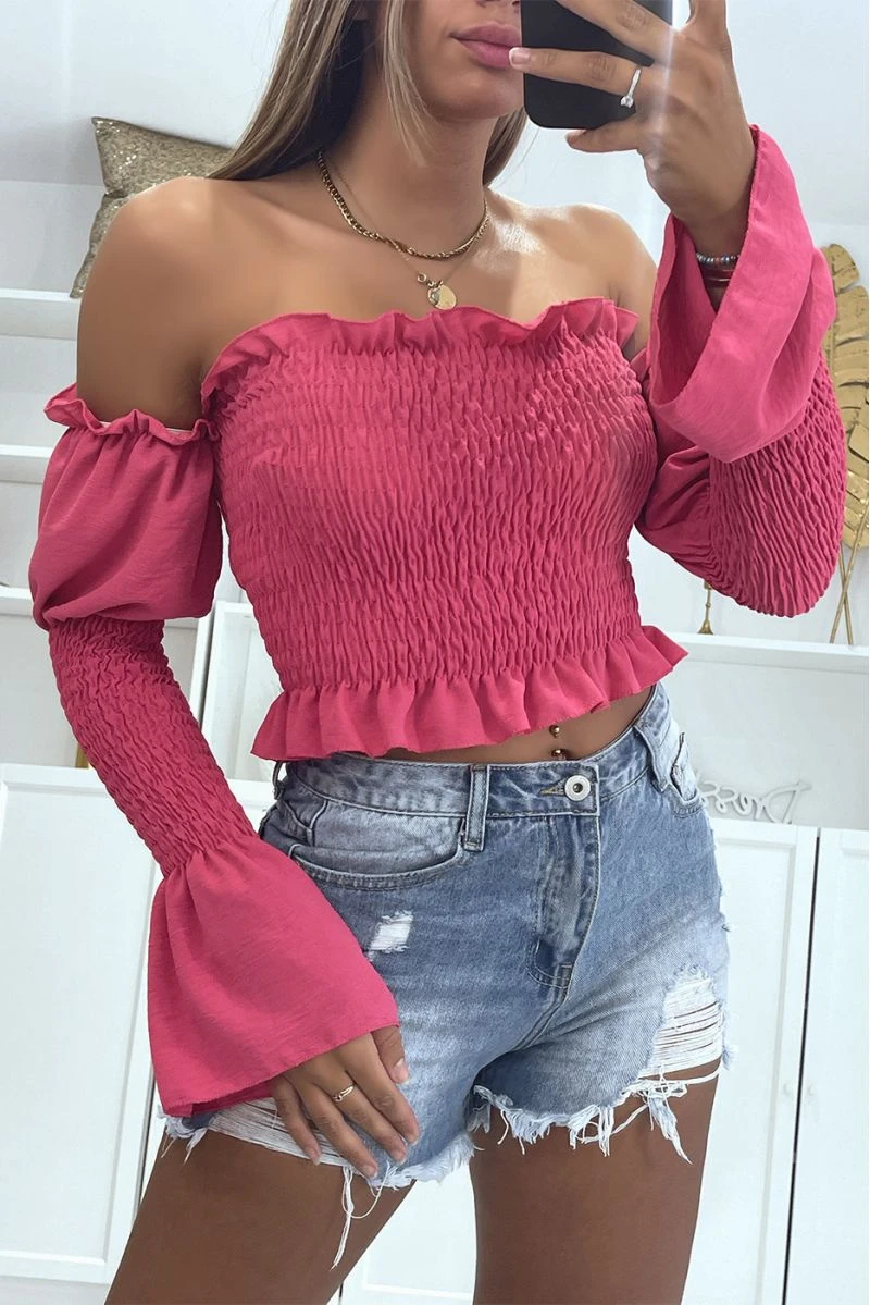 Crop top bateau froncé fuchsia à manches longues