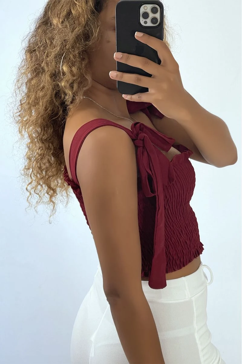 Crop top bustier froncé bordeaux avec bretelle à nouer