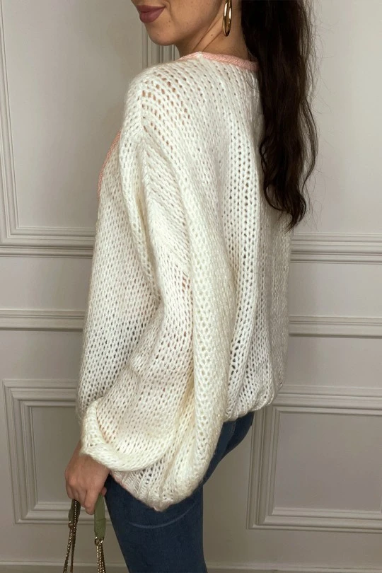 Gilet blanc duveteux à contour rose en maille torsadée