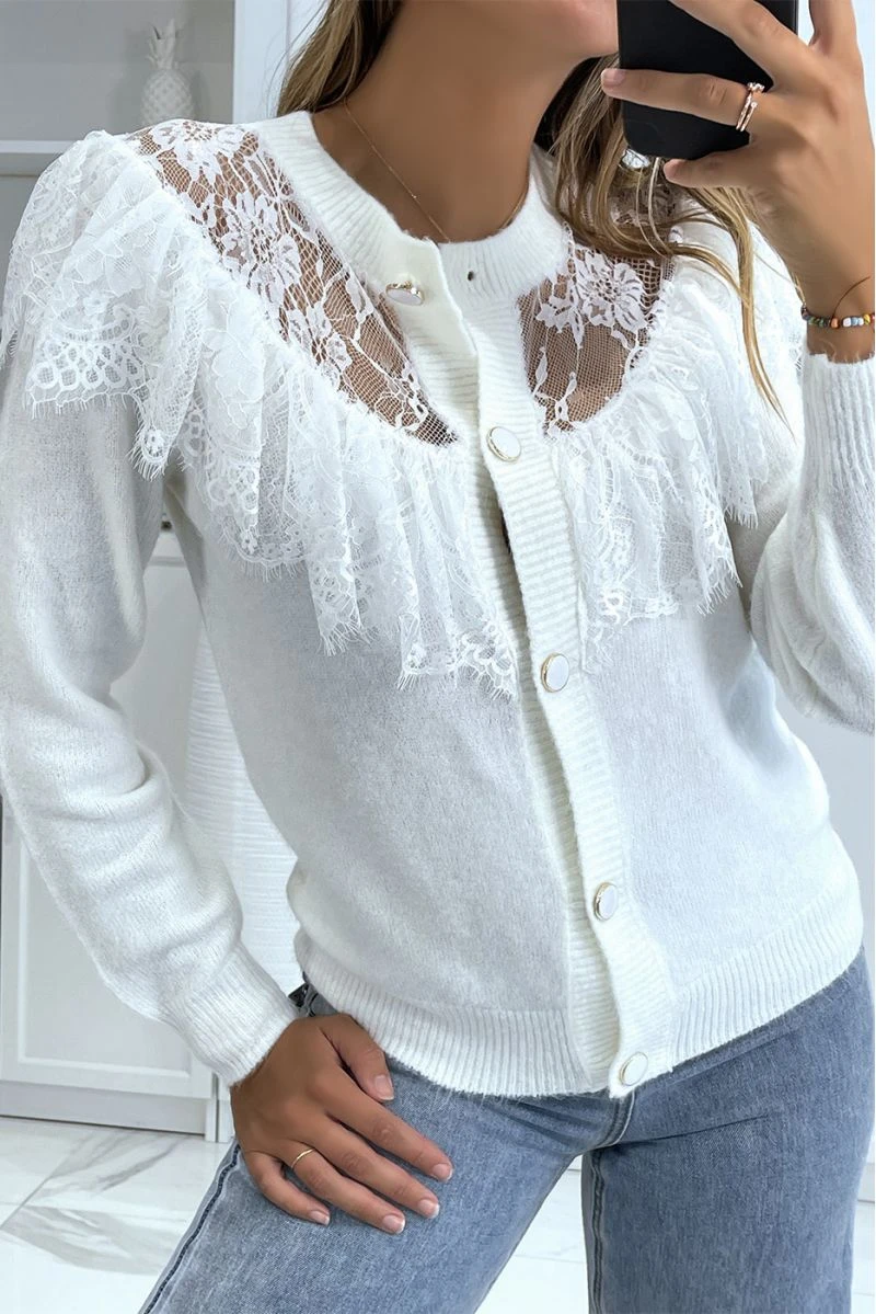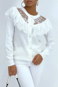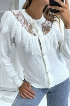 Gilet chic blanc en dentelle et Ă volants. Gilet style vintage en dentelle transparente sur le col et Ă bouton rĂ©tro style casual chic.Â