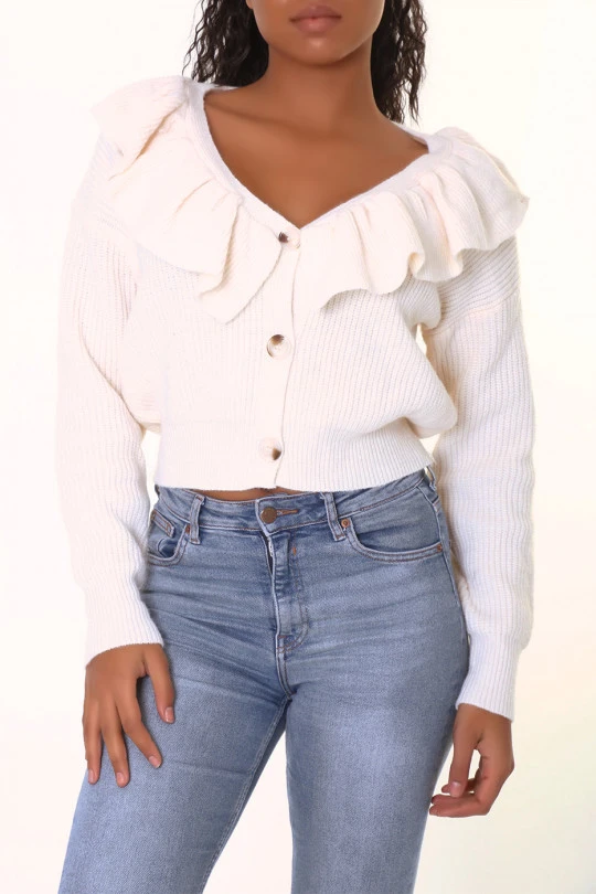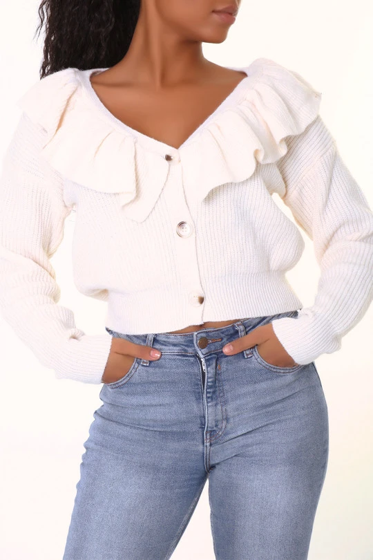 Gilet court beige chaud et doux Ă volants. Gilet col V effet bouffant et style vintage hyper tendance.Â