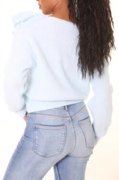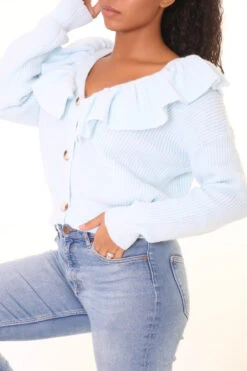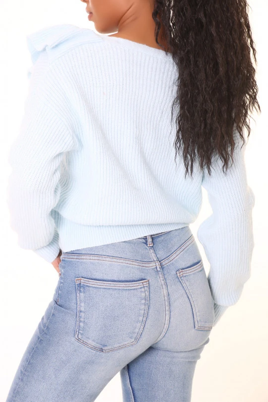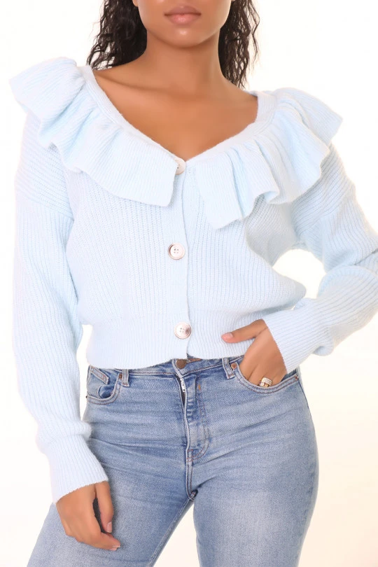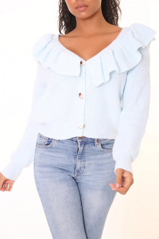 Gilet court blanc chaud et doux Ă volants. Gilet col V effet bouffant et style vintage hyper tendance.Â