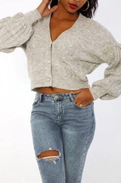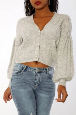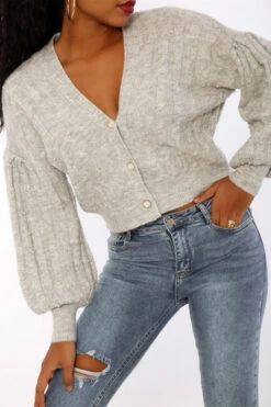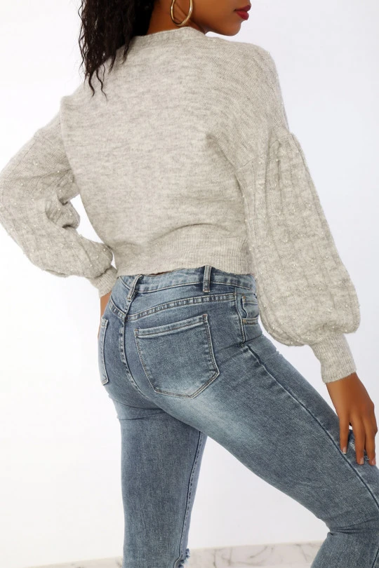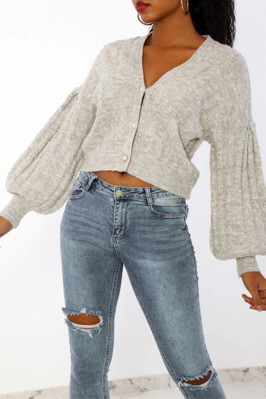 Gilet gris à perles tout doux effet cropé et bouffant. Gilet bien chaud à manches bouffantes.