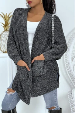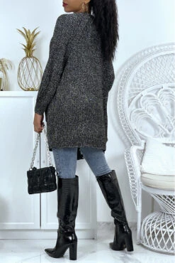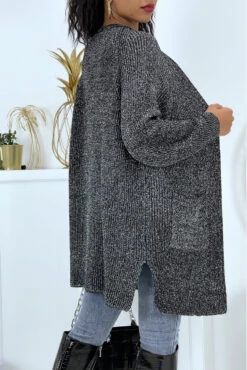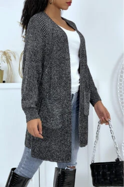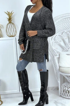Gilet mi-long noir argenté pailleté fendu sur les côtés en mailles avec manches bouffantes. Ce gilet très fluide est hyper confortable et convient à toutes les morphologies, à la fois tendance et chic, vous ne pourrez plus vous en passer. Ce gilet long en laine à poches indémodable est un indispensable de la saison.