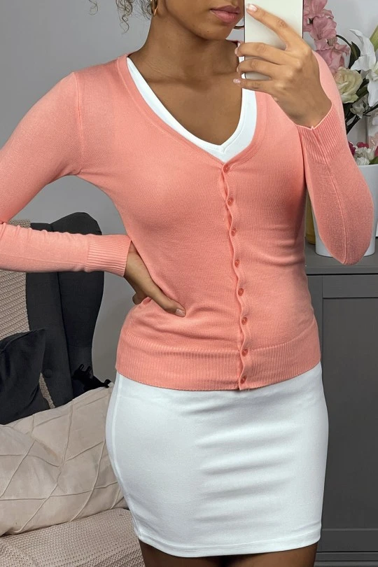 Gilet saumon en maille tricot très extensible, l’incontournable classique Gilet femme tendance, un basic indĂ©modable Ă porter Ă toutes les occasionsÂ