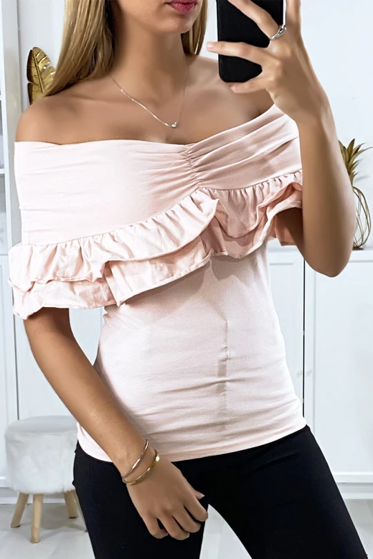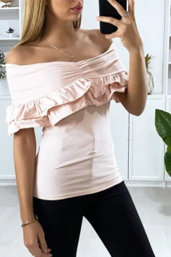 Haut beige pour femme col bateau Ă revers avec froufrou. VĂŞtement femme fashion et pas cherÂ