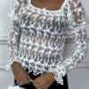 Haut Beige Effet Velours Et Maille Transparente Au Niveau Des épaules Pour Un Effet Col Bateau