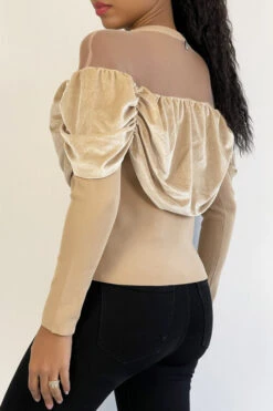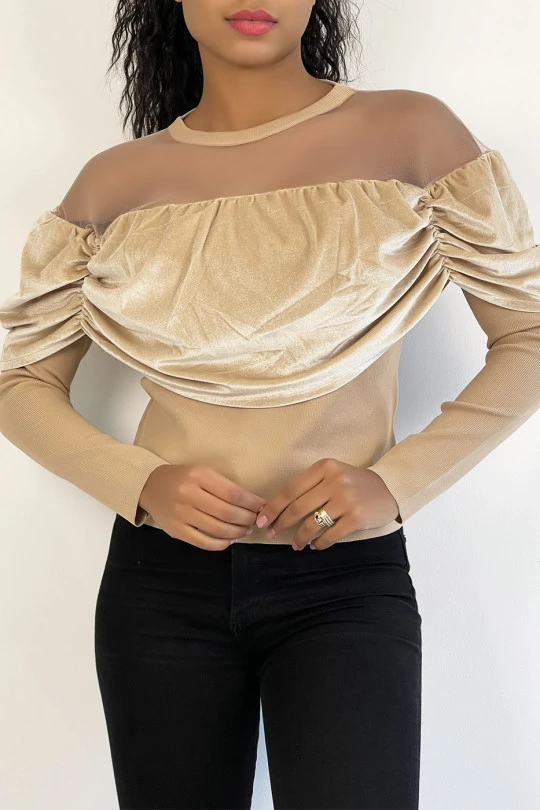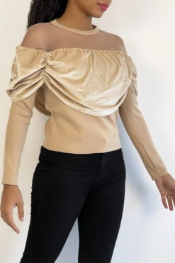 Haut beige effet velours et maille transparente au niveau des Ă©paules pour un effet col bateau. Ce top court hyper glamour s’accordera parfaitement Ă votre garde robe, c’est un incontournable du moment! Ce haut pour les fĂŞtes et soirĂ©es se porte avec une jolie jupe ou un leeging et des talons.