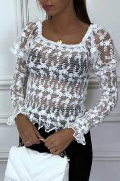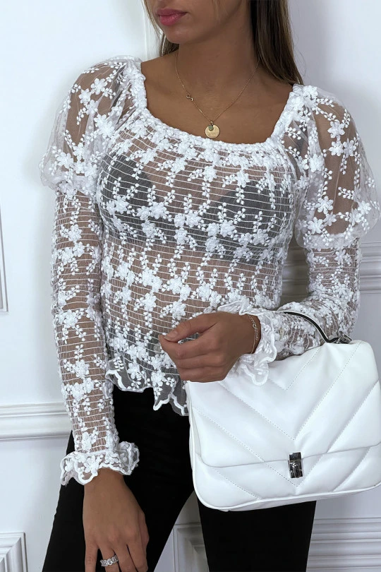 Haut blanc en dentelle avec épaules bouffante et élastique. haut pour femme très chic et tendance pas cher