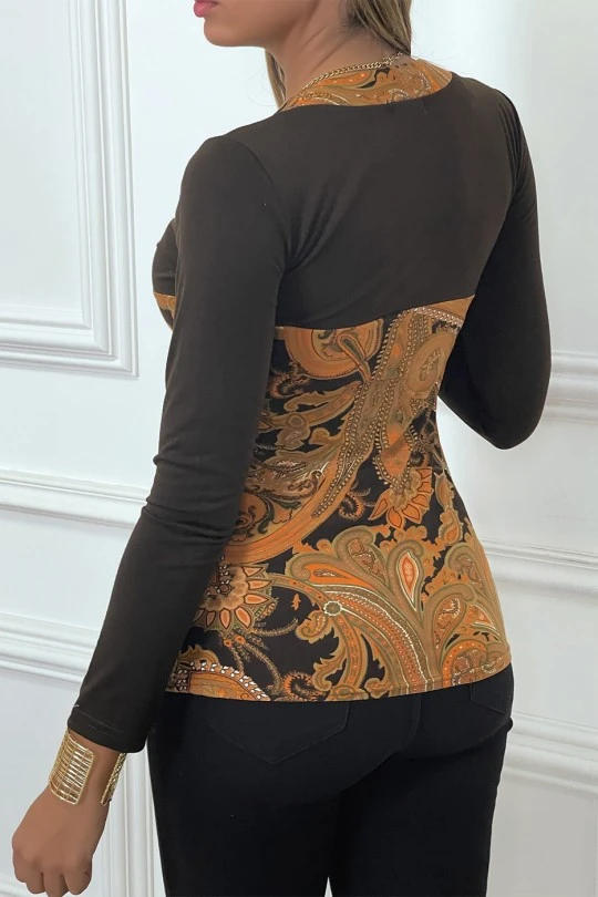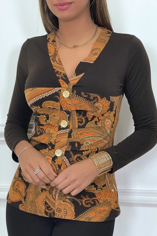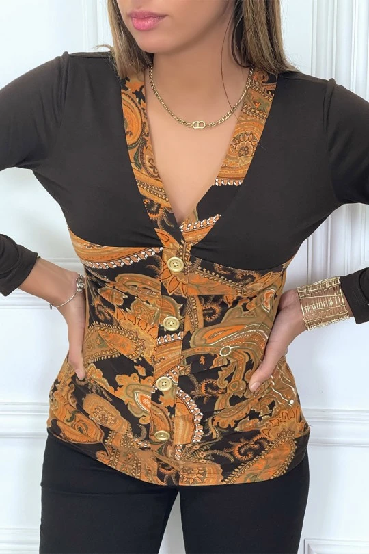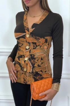 Haut Marron à Motif Orange Avec Boutons Dorée Et Fronce