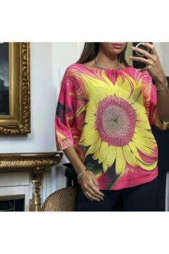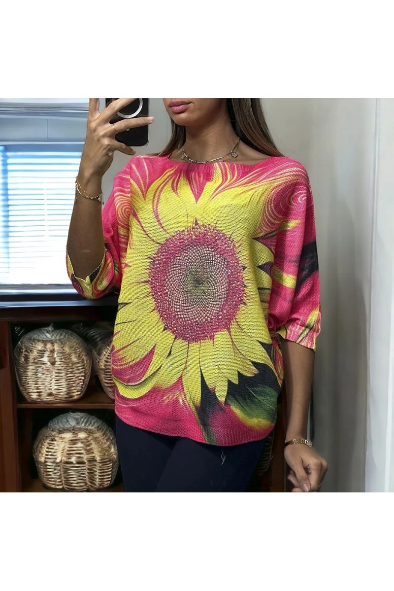 Haut over size manche chauve souris fuchsia motif fleur en maille tricot
