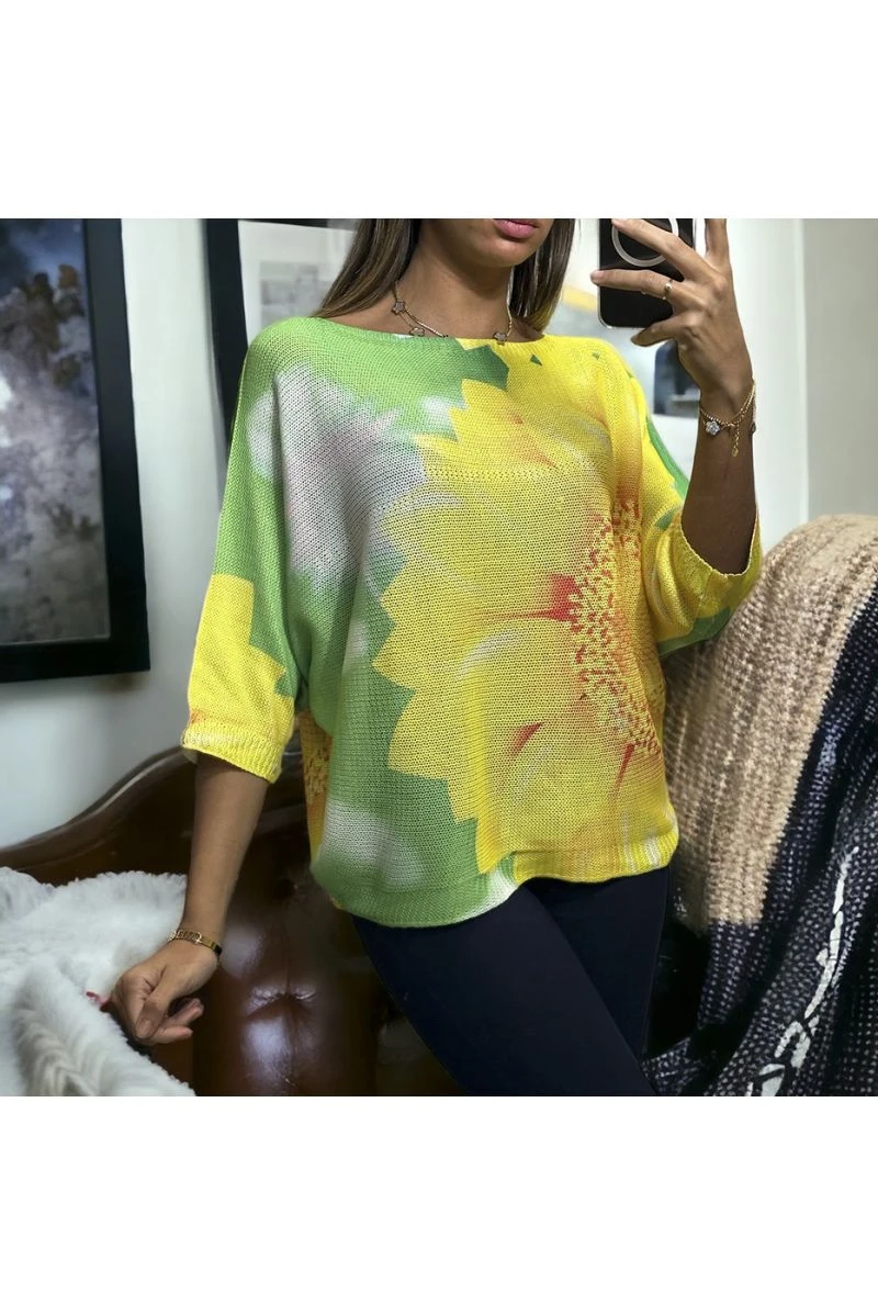 Haut over size manche chauve souris vert motif fleur en maille tricot