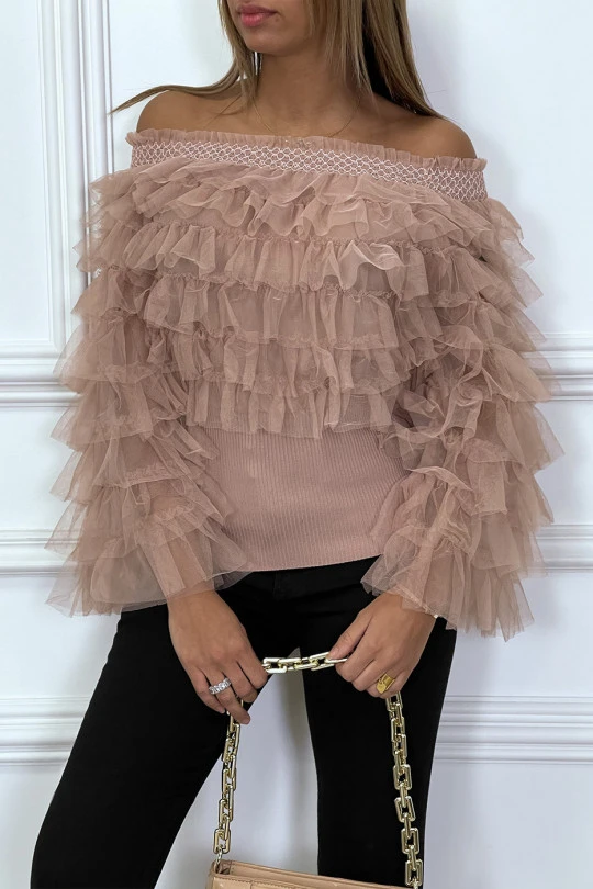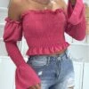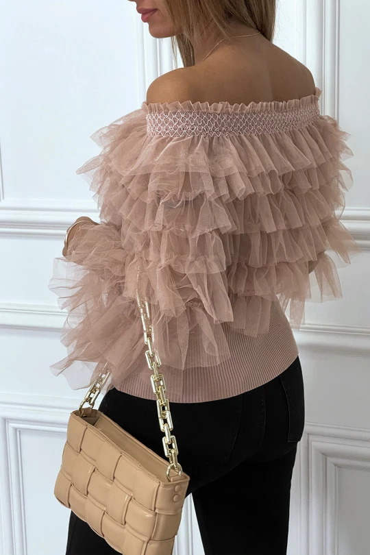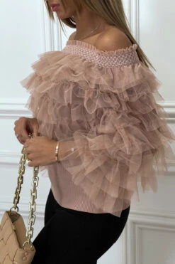 Haut rose bi matière à volants froufrou et col bardot, ce haut très classe est idéal pour vos soirées et évènements.
