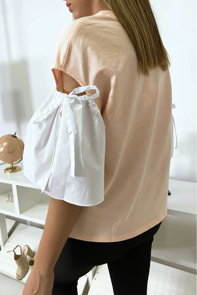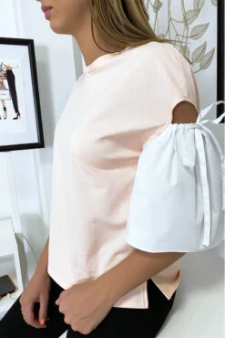 Haut rose avec manche bouffante avec lacet et dénudé. Mode femme ps cher