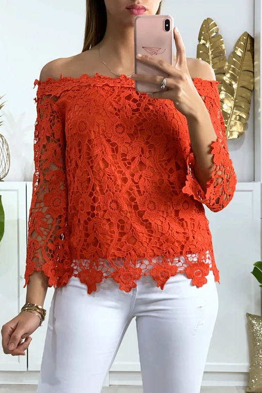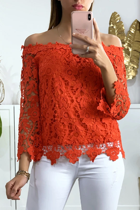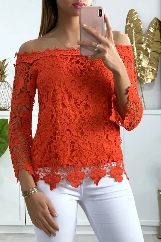 Haut Rouge En Col Bateau Dans Une Jolie Dentelle Doublé