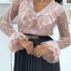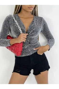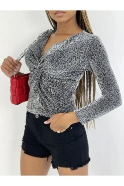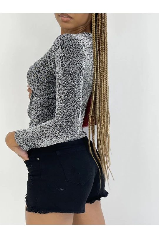 Haut scintillants avec imprimés léopard argent à manches longues, col v. Idéal pour sortir, ce haut rendra votre tenue beaucoup plus ravissante.