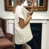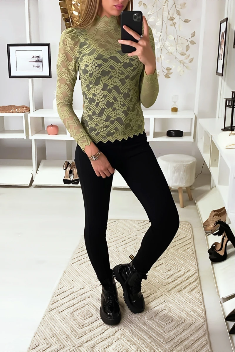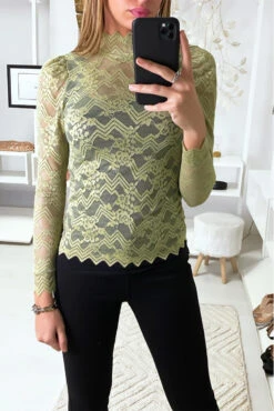 Haut vert en dentelle avec différents motifs et col haut. A porter pour toutes occasions avec un débardeur ou un soutien-gorge couleur peau.