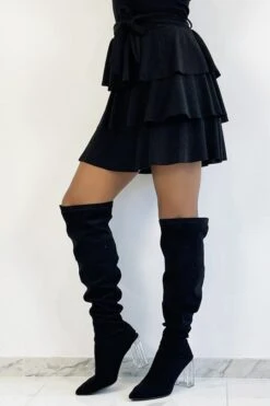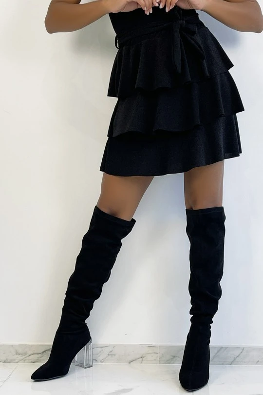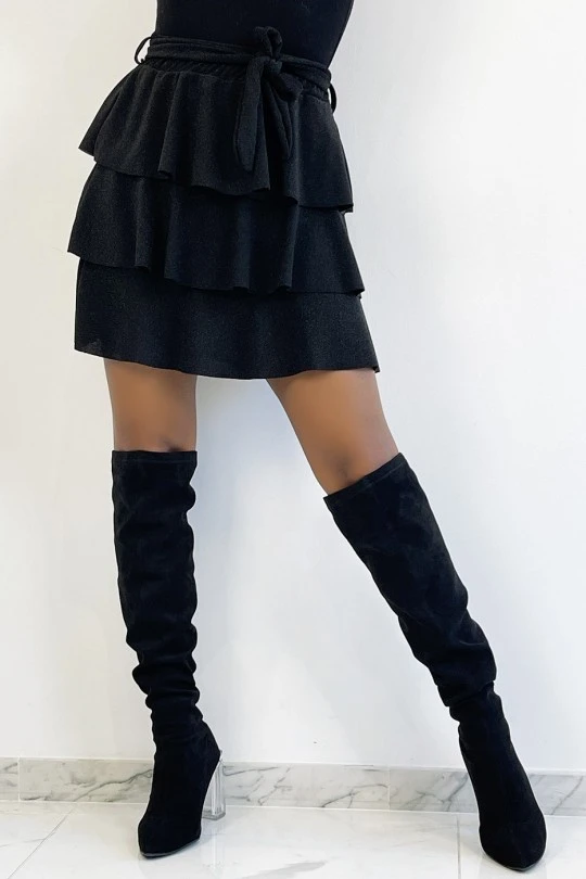 Jupe courte Ă volant et paillettes noire. Jupe brillante idĂ©ale pour crĂ©er une tenue de fĂŞte glamour.Â