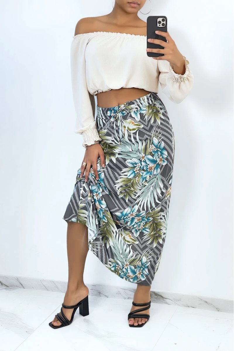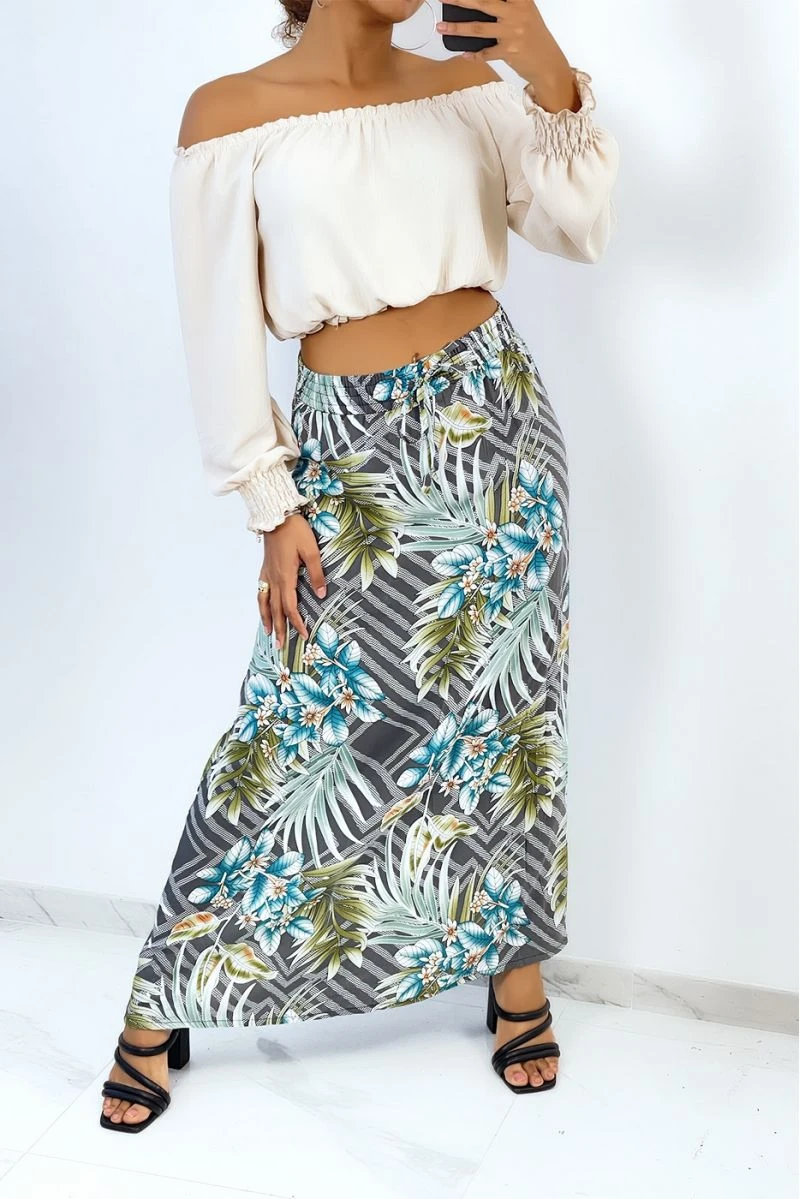 Jupe longue grise évasée à imprimé tropical et fleuri.