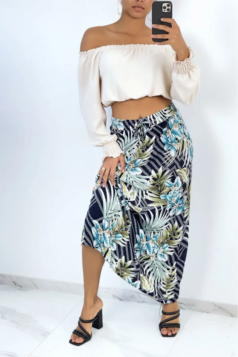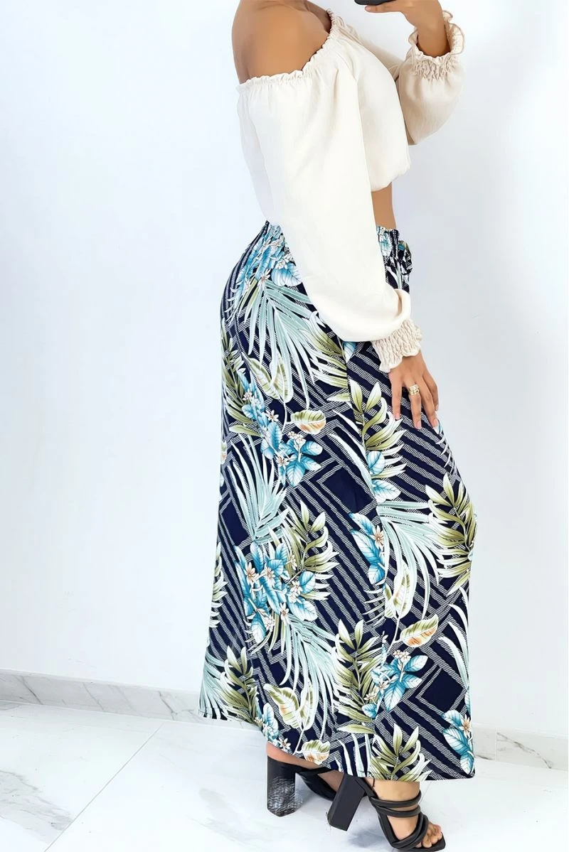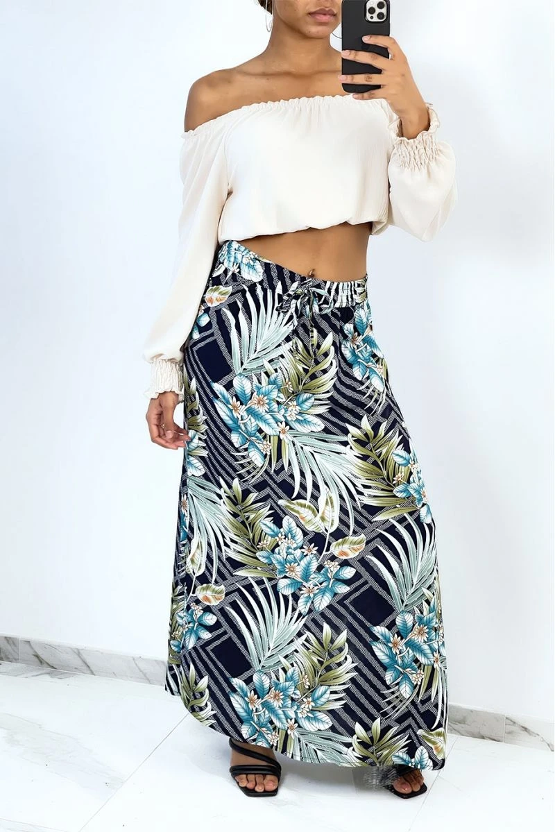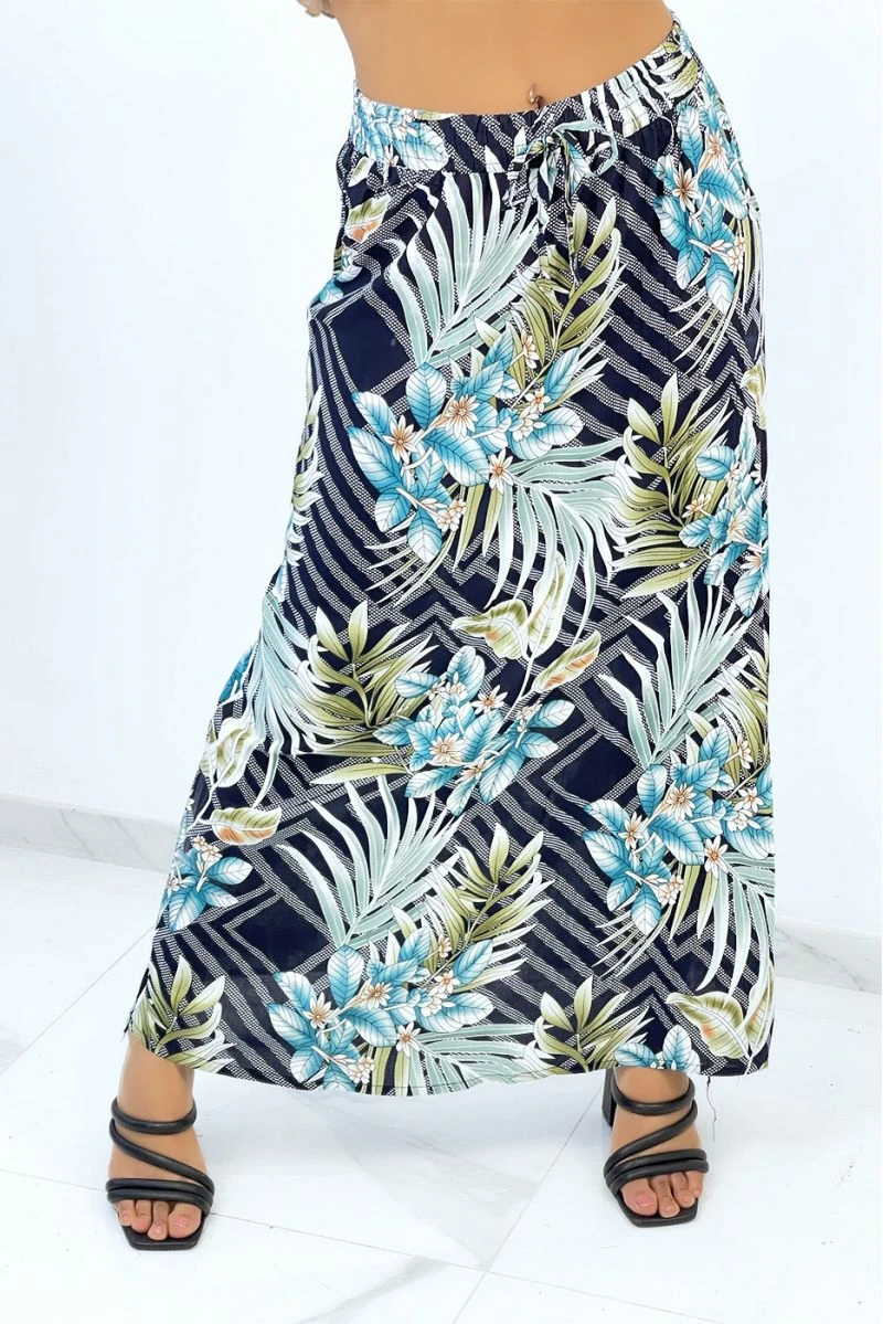 Jupe longue marine évasée à imprimé tropical et fleuri.