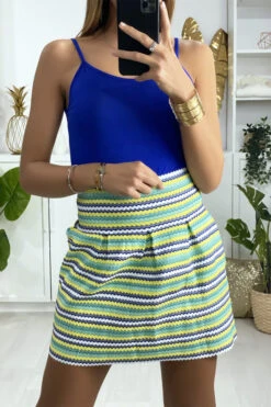 Jupe rayé à dominance vert avec plis et fermeture à l’arrière. Vêtement femme pas cher
