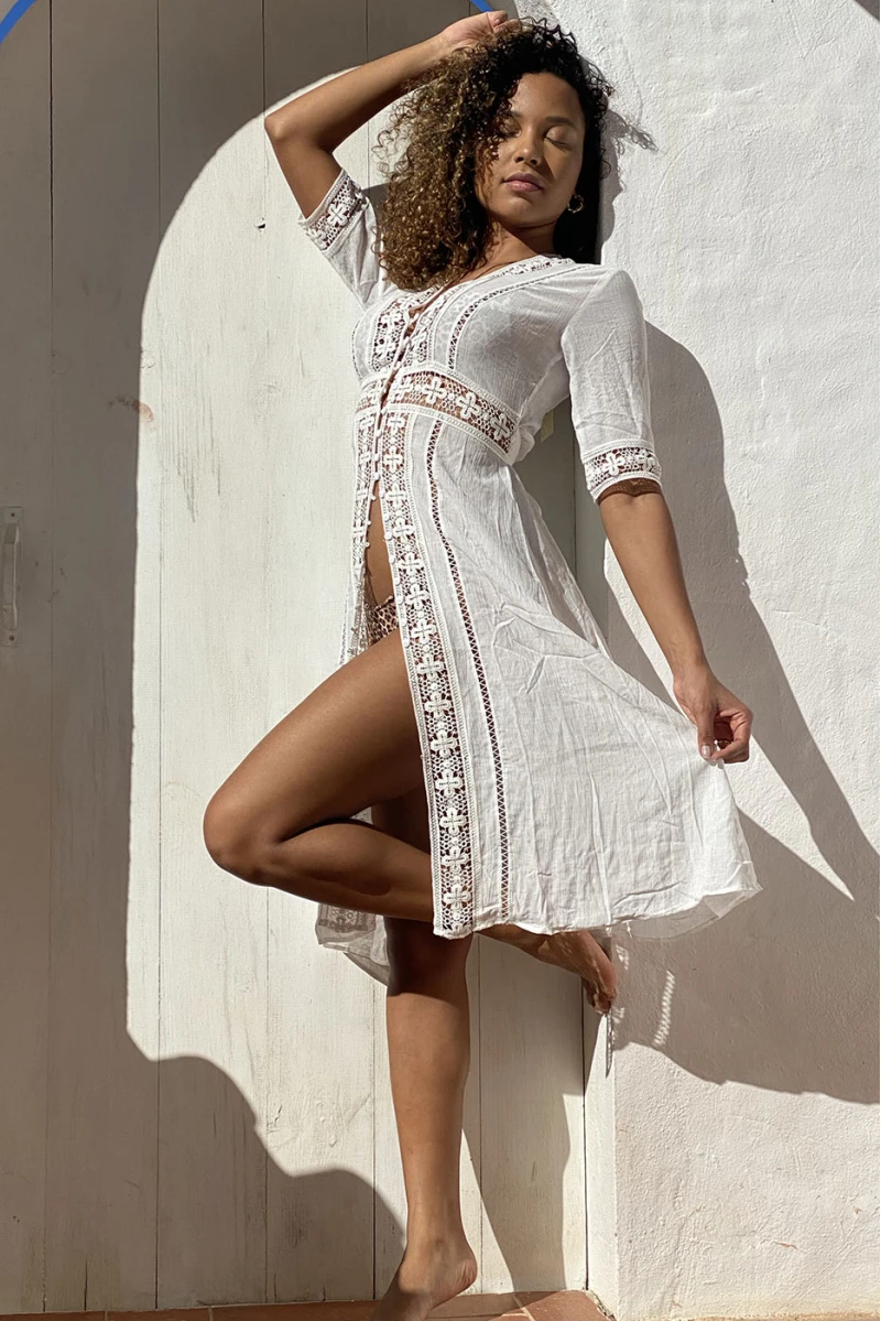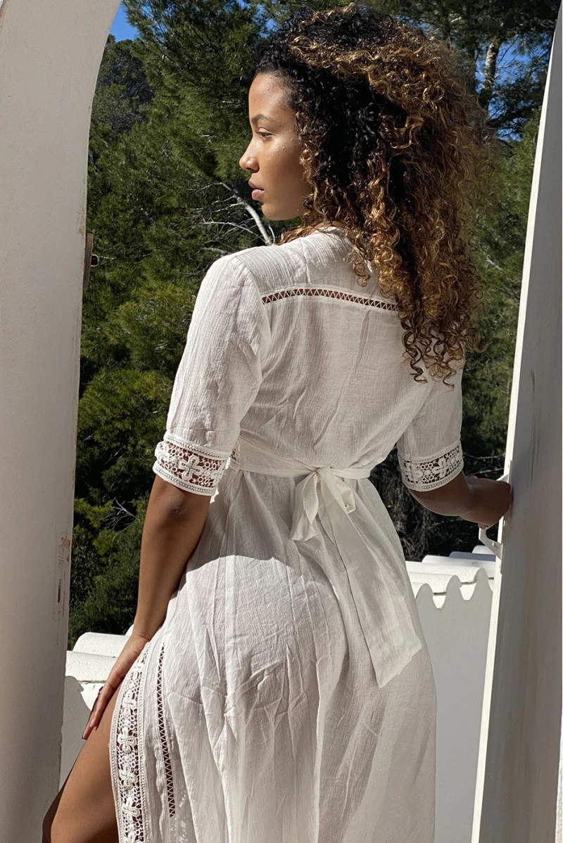 Kimono d’été léger fluide beige avec détails broderie. Kimono style bohème chic idéale pour accessoiriser un short ou une robe courte.