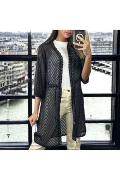 Kimono En Voile Brodé Noir Ajustable à La Taille