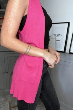 Long gilet fuchsia sans manches avec poches. Gilet sans manches tendance en mailles fines.