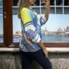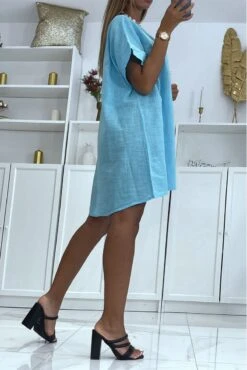 Long haut turquoise oversize effet lin à col rond et manches à revers avec joli collier style bohème chic