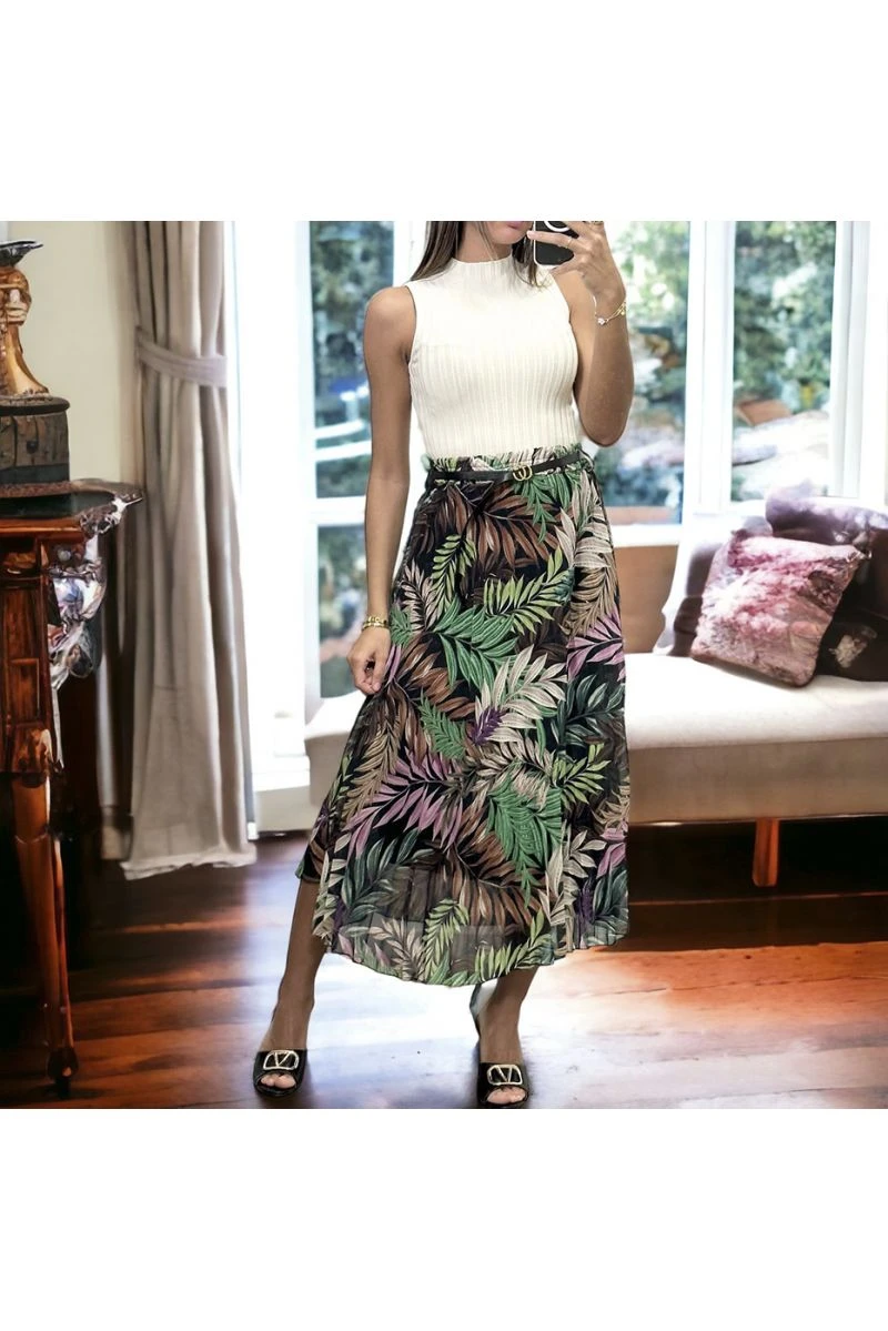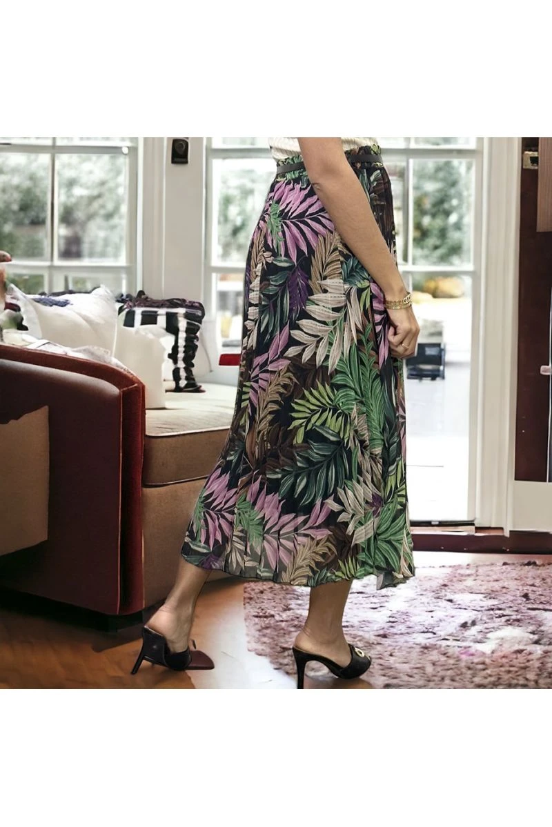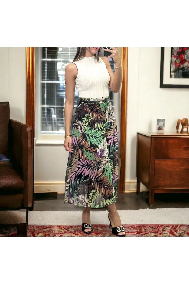 Longue jupe noire motif feuille avec ceinture