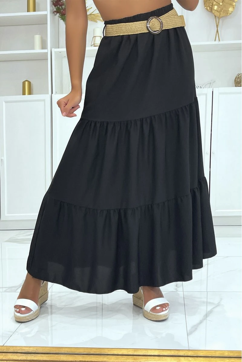 Longue jupe noire style bohème chic avec magnifique ceinture effet paille à fermoir rond