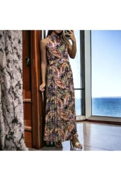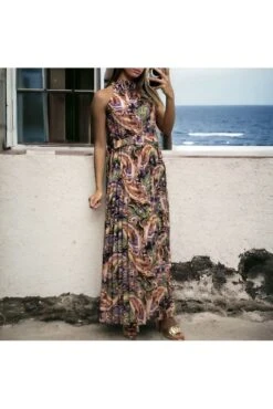Longue robe plissé noir avec ceinture sublime motif imprimé
