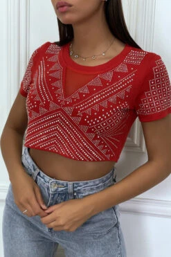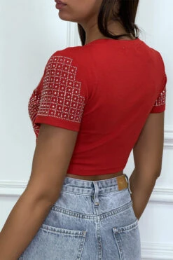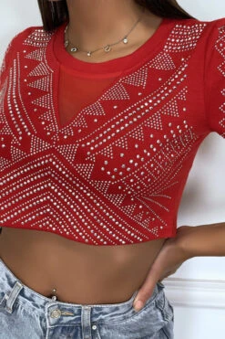 T-shirt court rouge à manches courtes avec des strass, à col rond. Tendance et agréable porter cette pièce va vous conquérir.