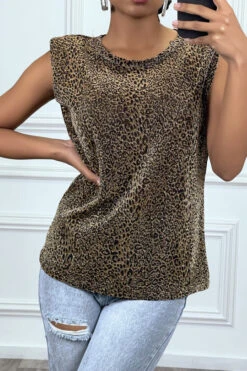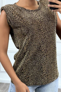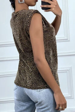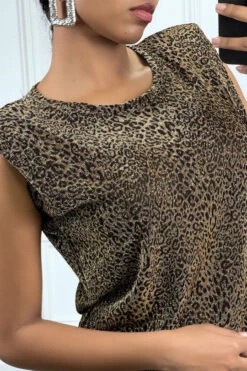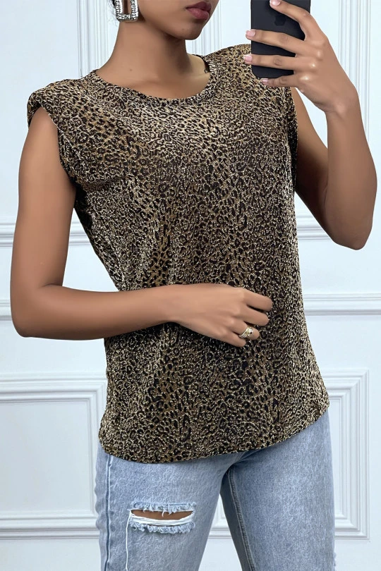 T-shirt dorée avec épaulettes et motif léopard. Vêtement femme tendance et pas cher