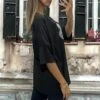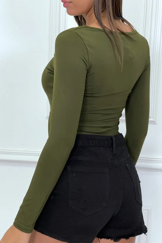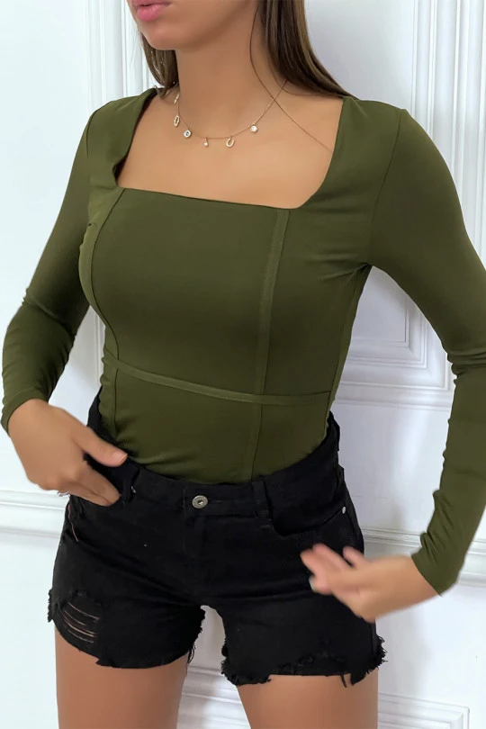 T-shirt kaki manches longues à col carré. Simple à accessoiriser et simple à porter.
