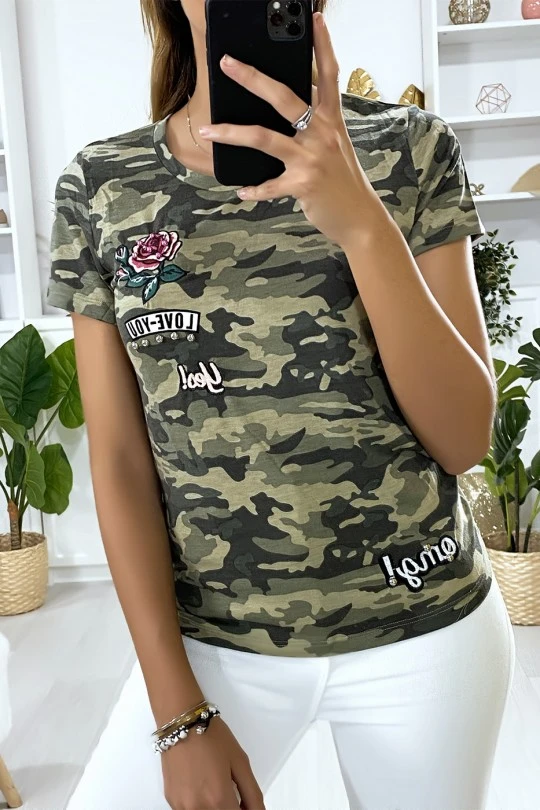 T-shirt kaki militaire pour femme avec broderie. VĂŞtement femme pas cherÂ