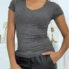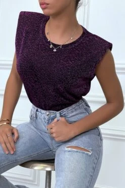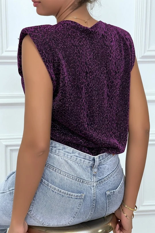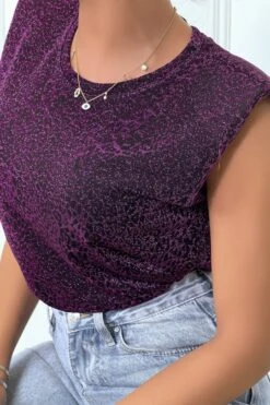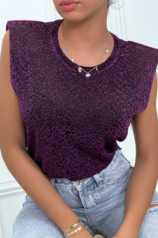 T-shirt lilas avec épaulettes et motif léopard. Vêtement femme tendance et pas cher