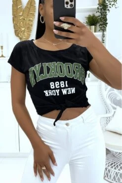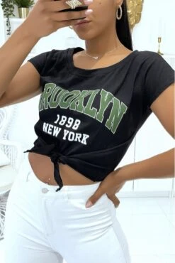 T-shirt manches courtes noir à joli noeud et écriture Brooklin